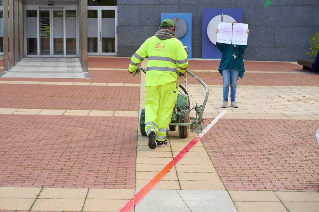 Israelek Gazako palestinarrei egindako giza eskubideen urraketa sistematikoa salatzeko Estatuko hainbat hiritan egiten diren ekintzen barruan, Joëlle Tuerlinckx artistak (Brusela, 1958) bere A LEGAL MUSEAL TAG 58 m (2017 remake 2024) lana berriz margotzea proposatu du, Artium Museoaren kanpoko plazan. Obra hori lerro zuri bat da, museo-kodeen barruan kolore neutraltzat hartzen dena eta, salbuespen gisa, gorriz margotu da.